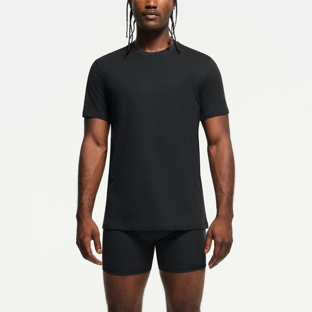 The ultimate undershirt: SKIMS of course. Every guy needs this 3-pack of tees featuring a slightly longer length than our SKIMS Cotton Mens Classic T-Shirt. Made from 100% lightweight cotton with a dry hand feel and clean seam lines for an invisible look under clothes. Includes ribbing at the crewneck. Fits true to size.