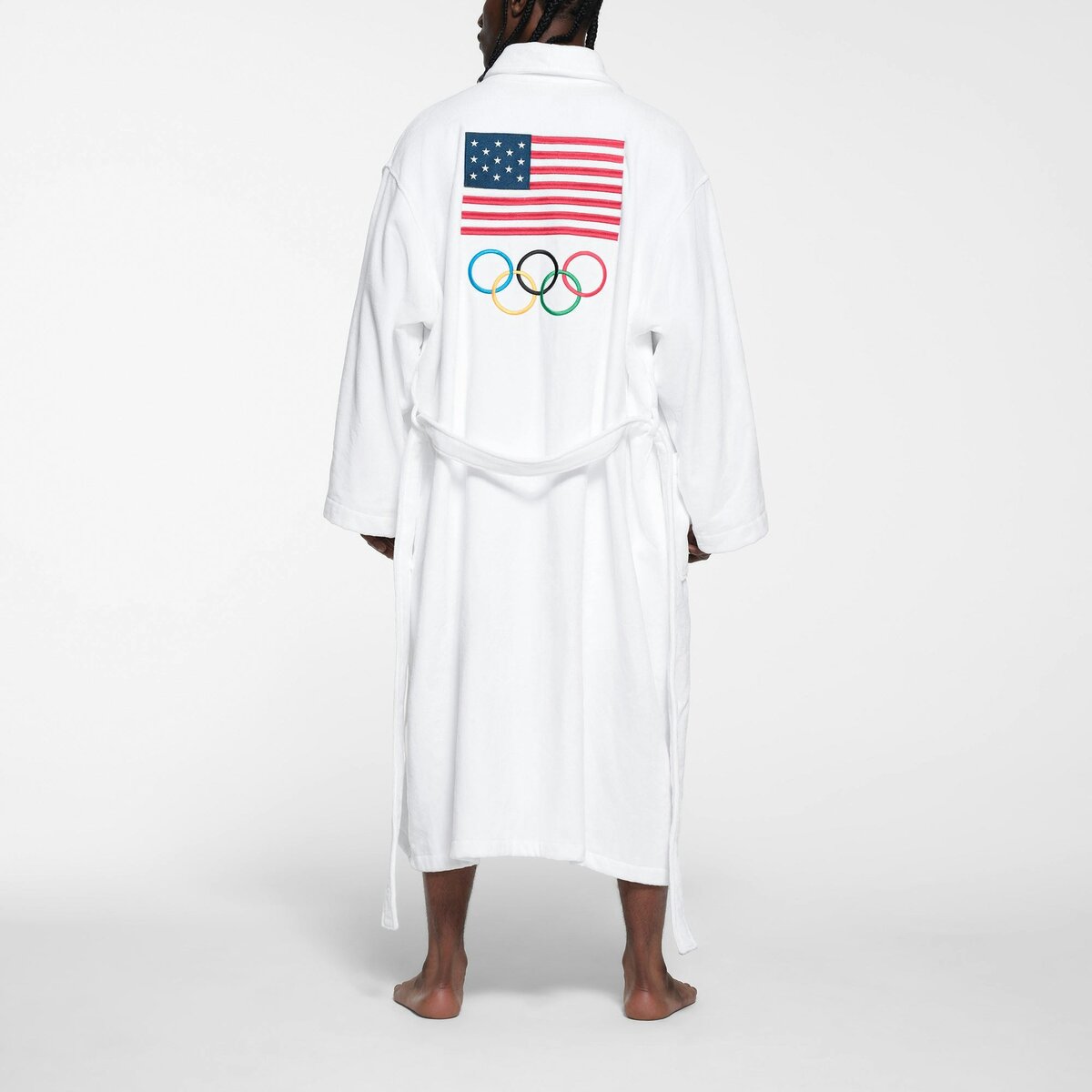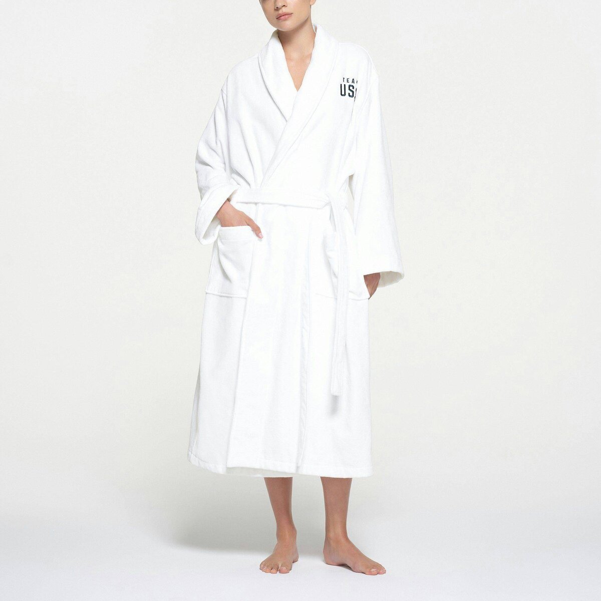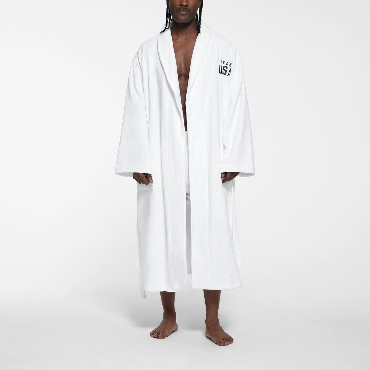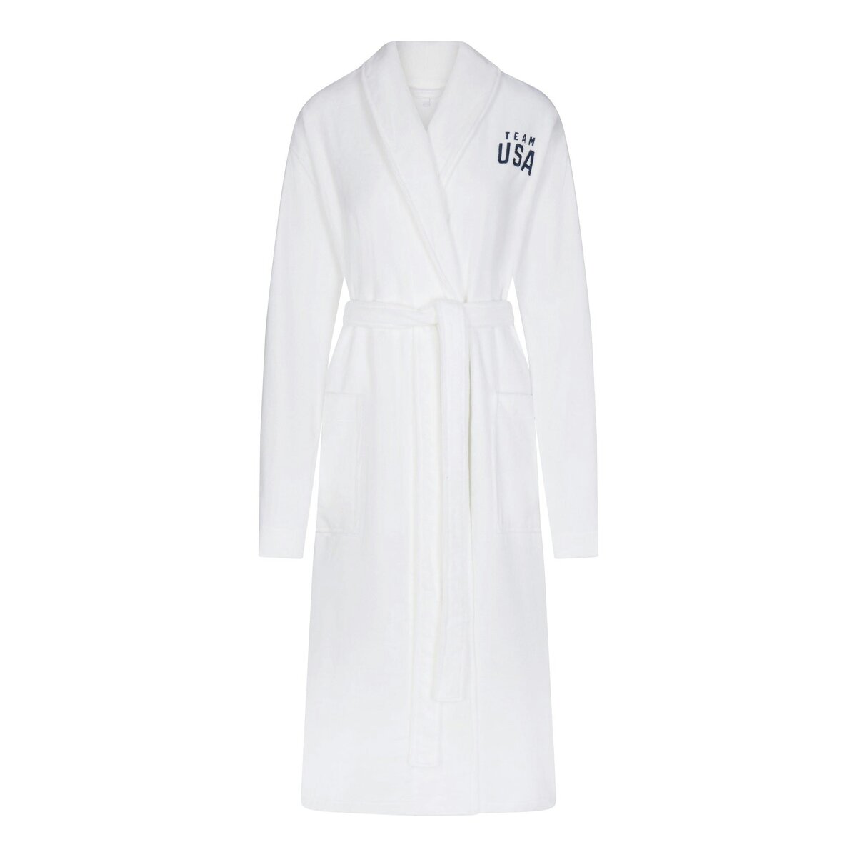 This full-length, 100% cotton robe is comfortably soft and plush. Detailed with a lapel collar, side patch pockets, and a waist tie. Features official graphics in support of Team USA athletes participating in the Olympic Games Paris 2024. Fits true to size.