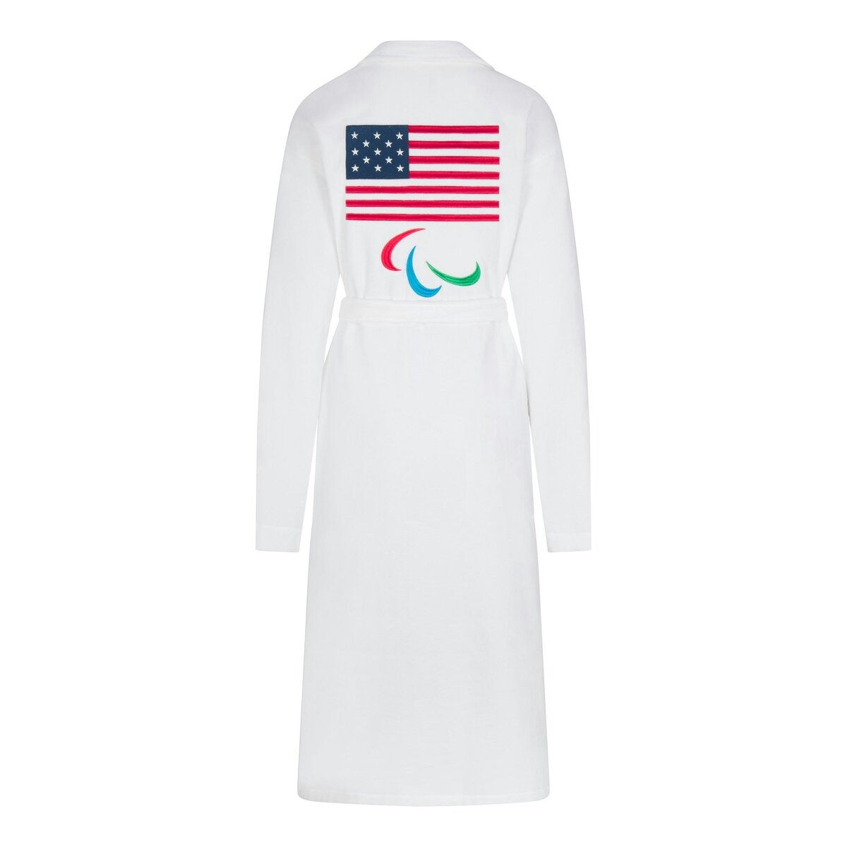 This soft, full-length lounge robe is made with 100% cotton for plush comfort. Classic details include a lapel collar, side patch pockets, and a waist tie. Features official graphics in support of Team USA athletes participating in the Paralympic Games Paris 2024. Fits true to size.