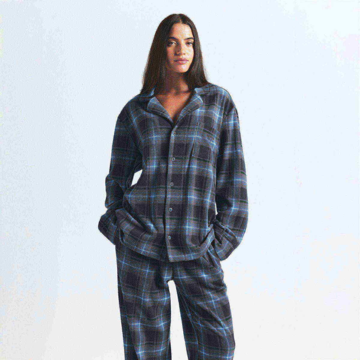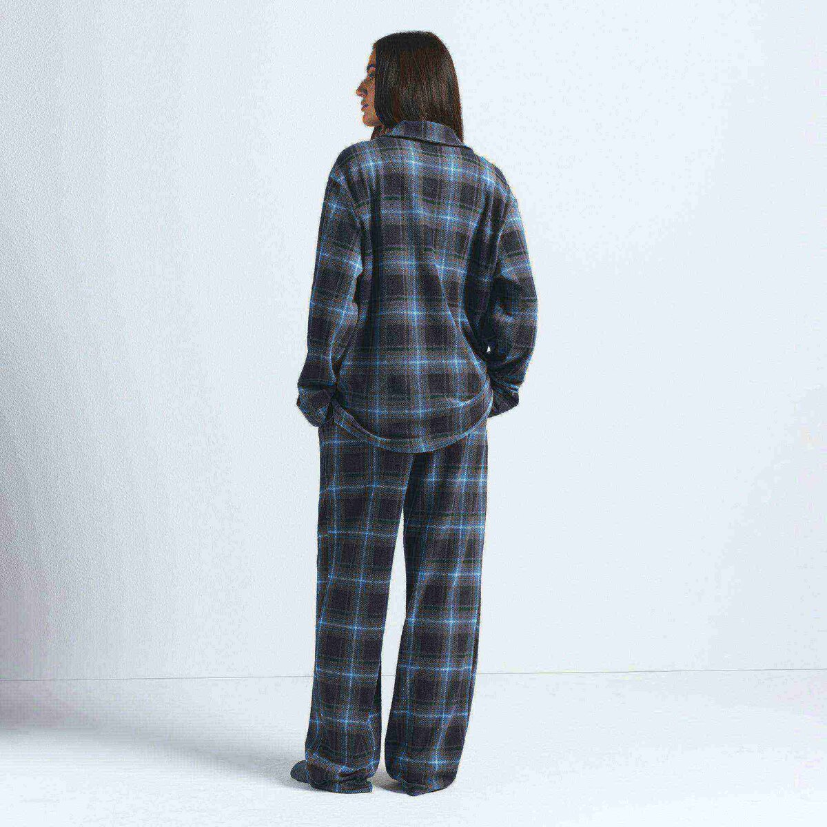 Get your best rest in this incredibly comfortable, steal-worthy sleep set. Designed with a relaxed, oversized fit for your ultimate comfort, this set includes a classic button up long sleeve with engraved SKIMS logo at the chest pocket and wide leg pants with side pockets. Comes specially packaged in a branded gift box. Fits true to size for Men and comfortably oversized for Women.
