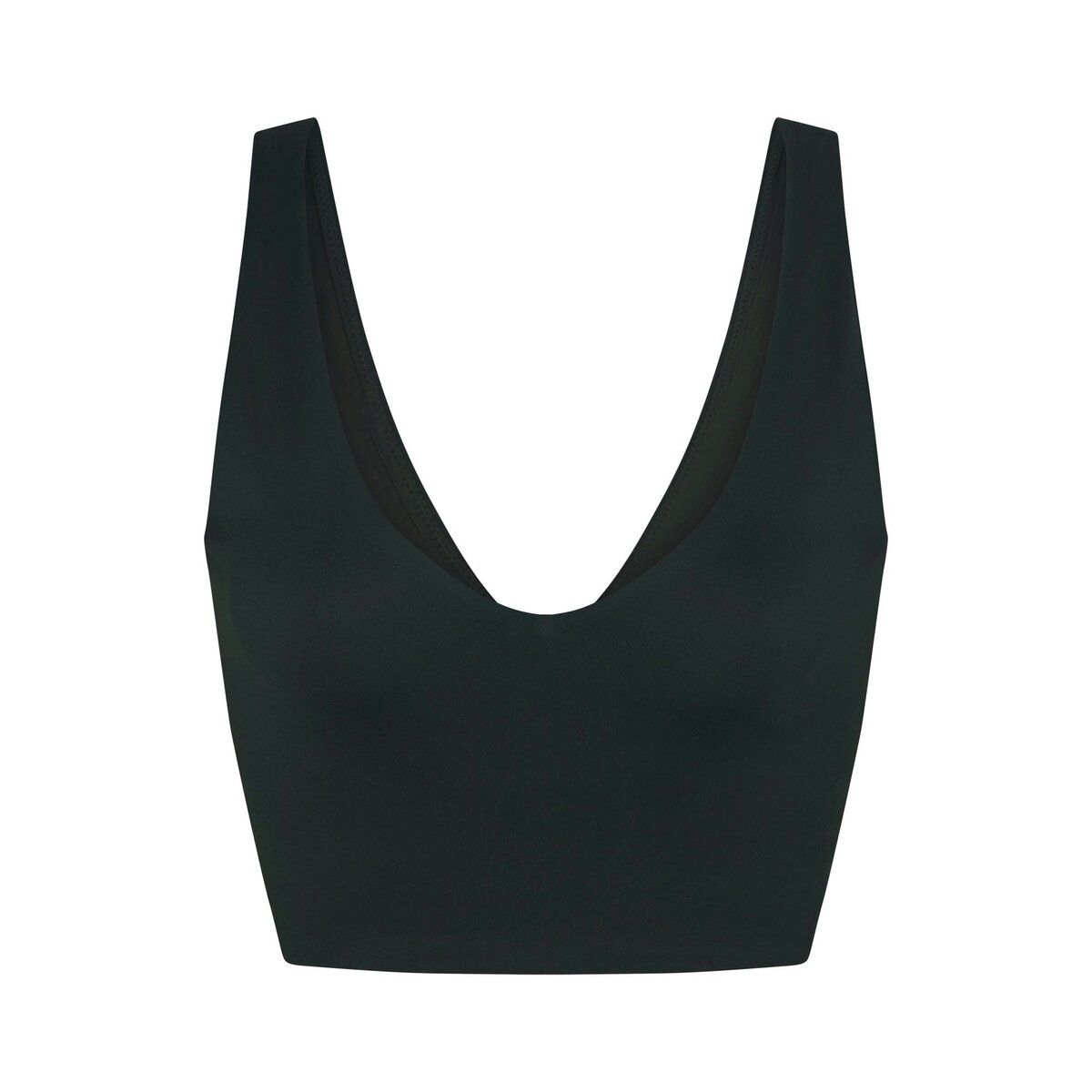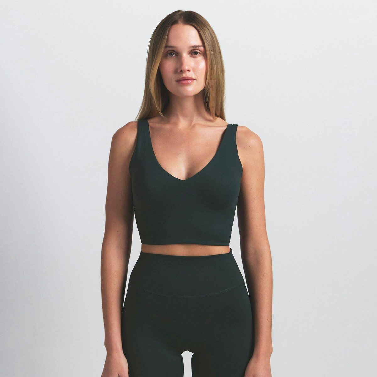 - Plunge V-neck, Slight kiss mold for added bust depth that does not flatten, Silicone matte logo at center back, Longline length, Pullover style, Fits tight to body, Best for low to medium impact