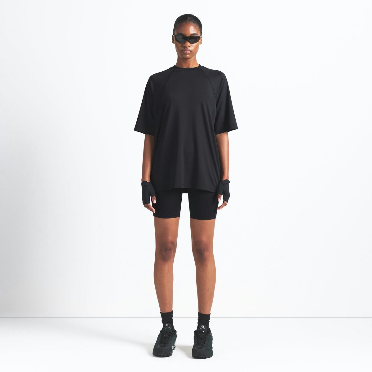 • Crew neck, Raglan short sleeves, Front, Side and back seam details, Silicone matte logo at center back neck, Oversized fit, Length: 28 ½”