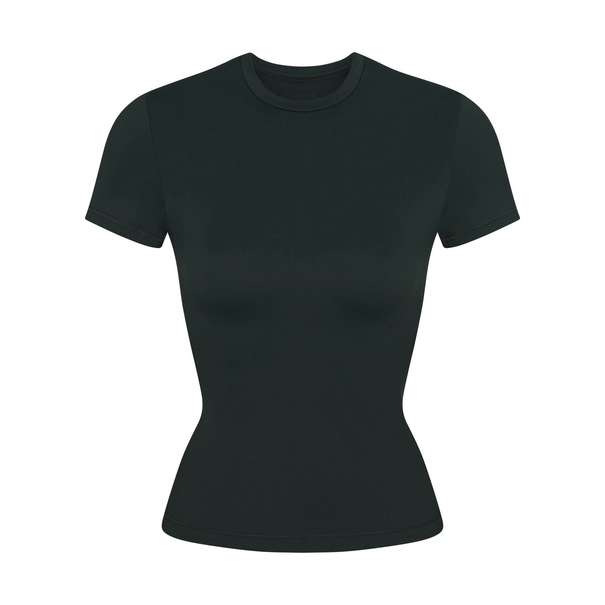 - Crew neck, Short sleeves, Built in spacer pad with underbust elastic, Smooth back with no visible bra lines, Fits tight to body, Length: 22″