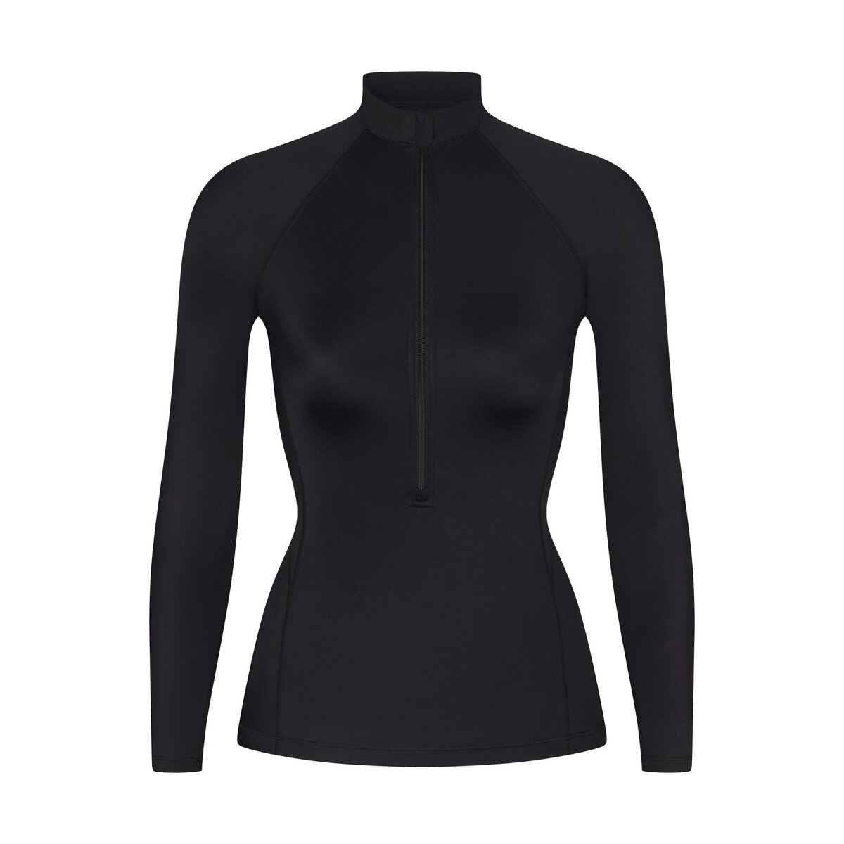 - Mock neck, Raglan long sleeves, Half zip closure, Silicone matte logo at center back, Fits tight to body
