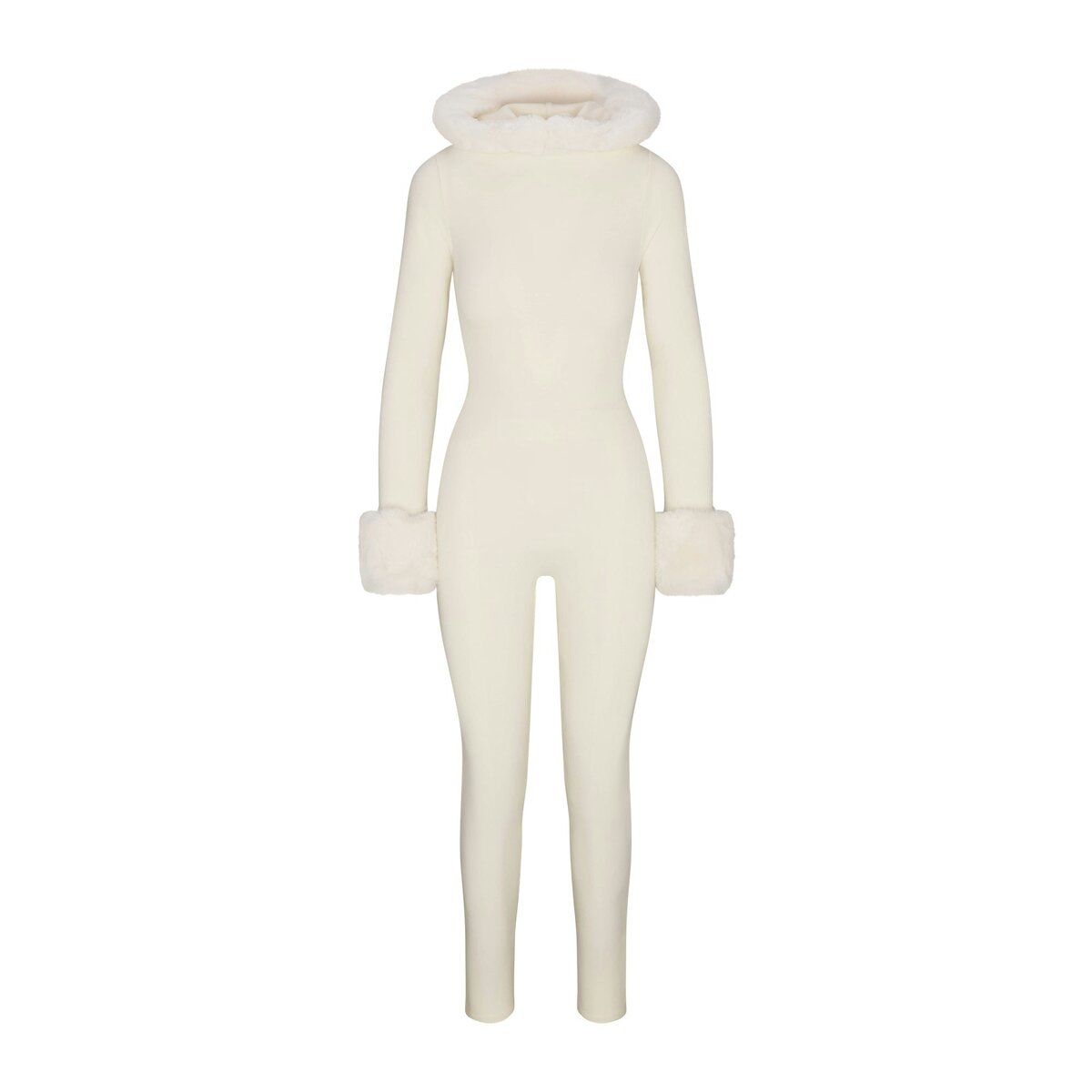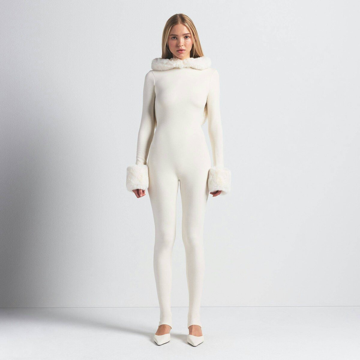 - Hooded catsuit, Long sleeves, Open back with satin bow detail, Faux fur trims at hood, Sleeves, And open back, Fits tight to body