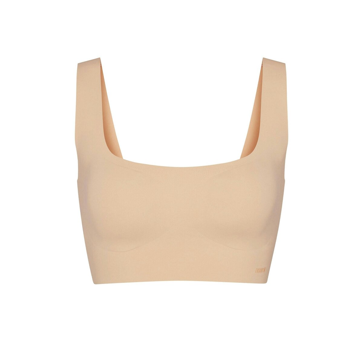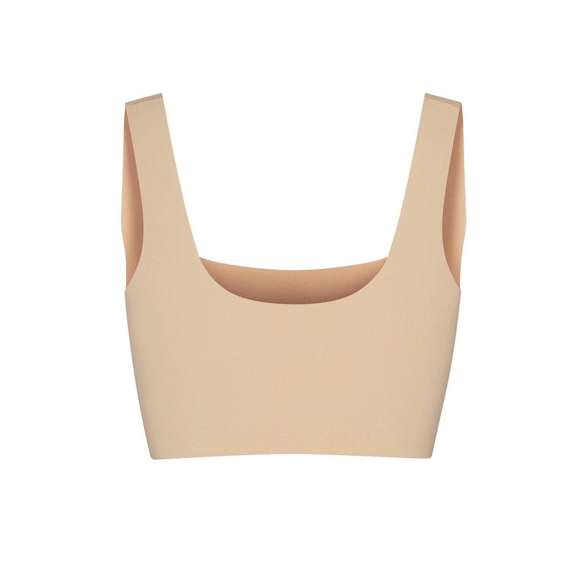 - Front slight scoop neckline, Unlined cups with removable pads, Wireless for maximum comfort, Non-adjustable wide smoothing straps, Smoothing wing that offers extra support along back and side, Tonal matte 3D silicone SKIMS logo on wing, Pullover style (no hook and eye)
