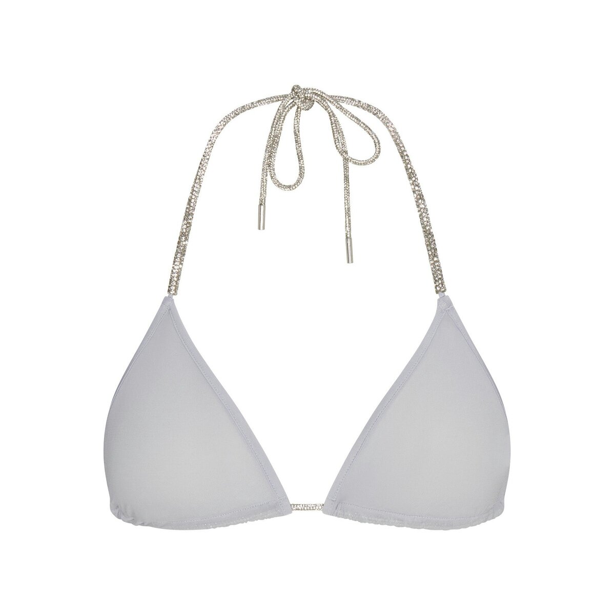 - Unlined triangle cups, Tunnel at bottom cup for coverage adjustability, Rhinestone cord ties at neck and back