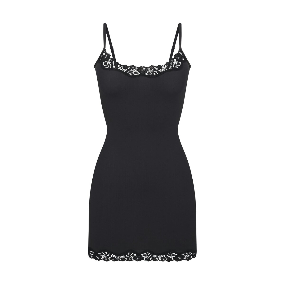 Slip into this buttery-soft, body-hugging mini dress with romantic stretchy lace trims. Features a front scoop neckline and adjustable straps. Fits true to size.