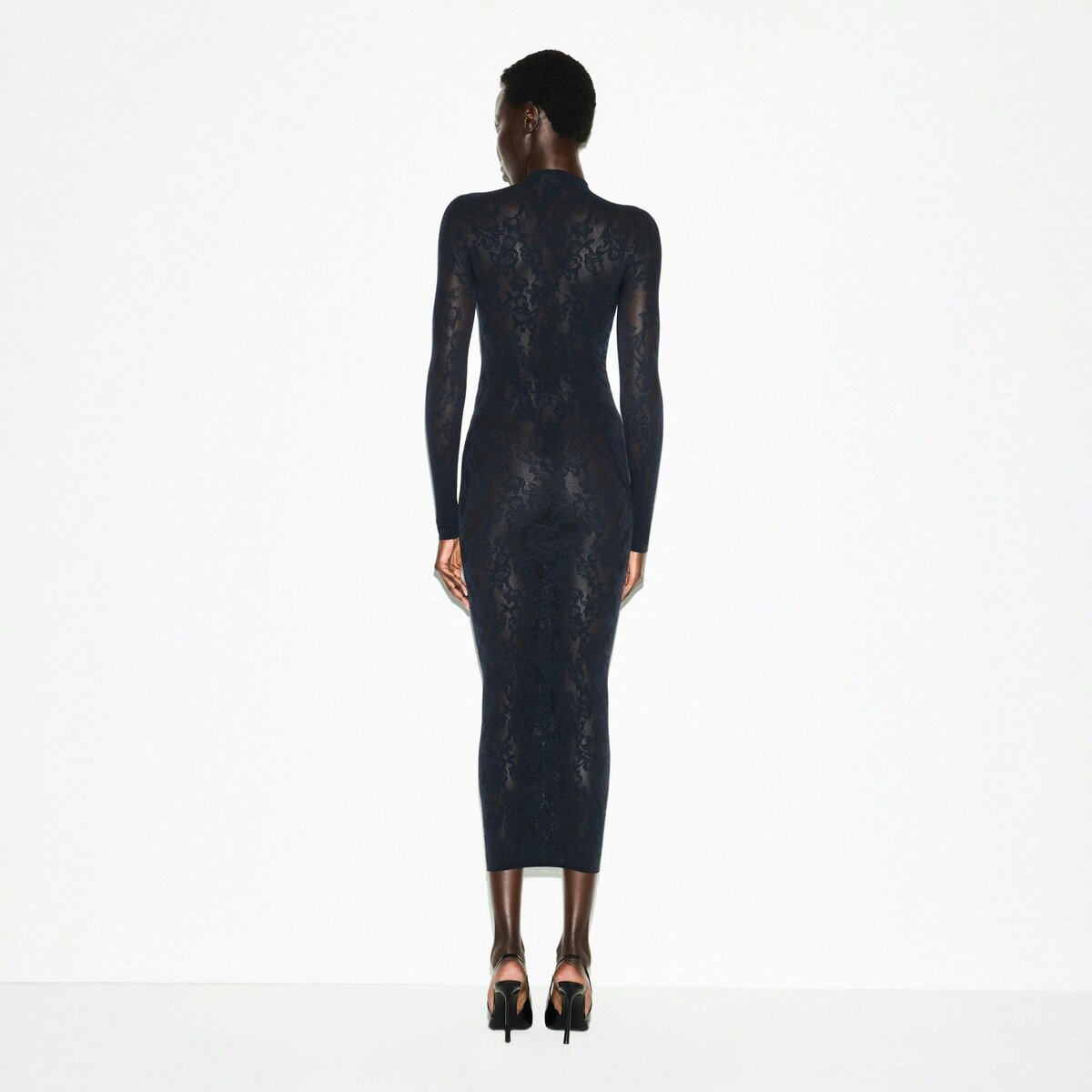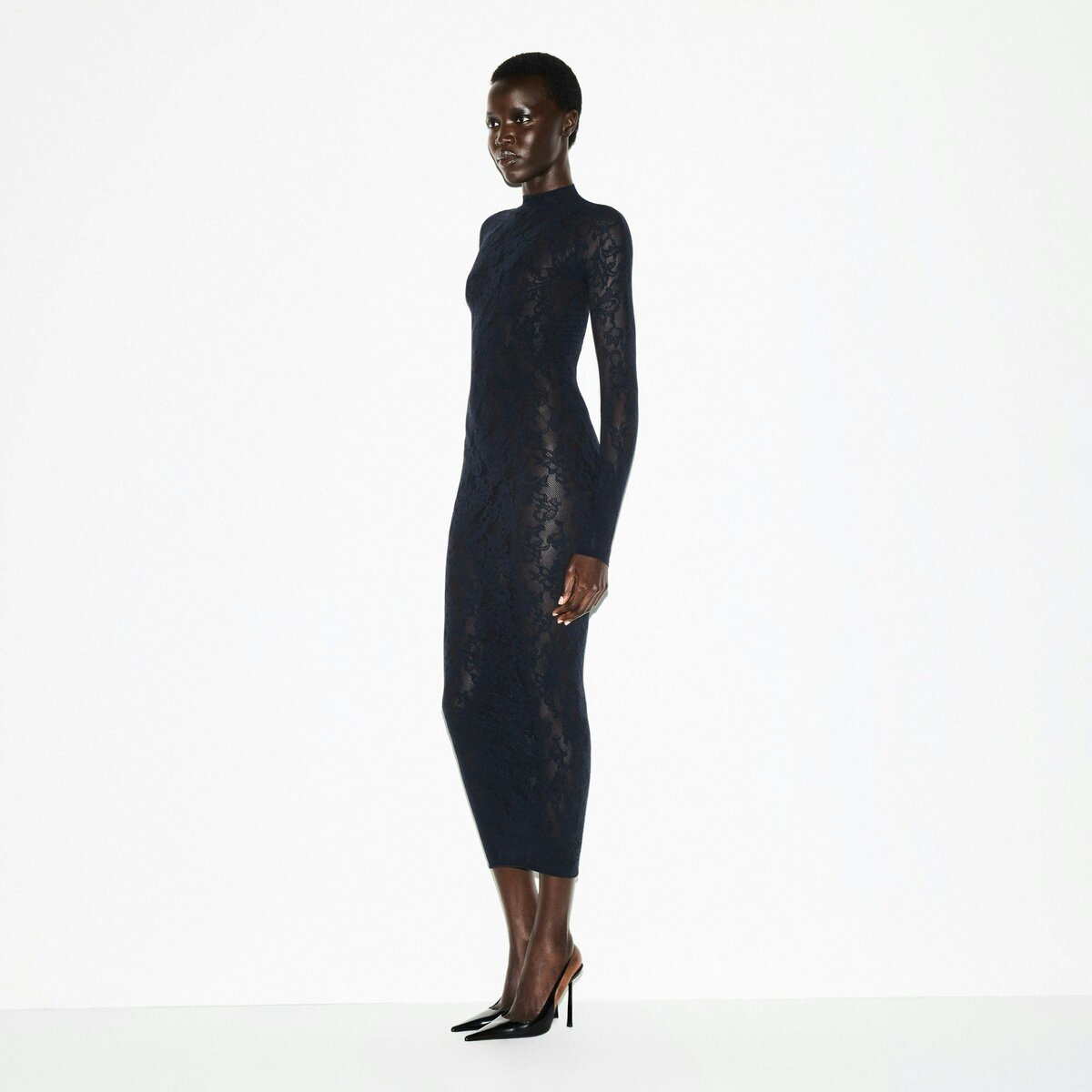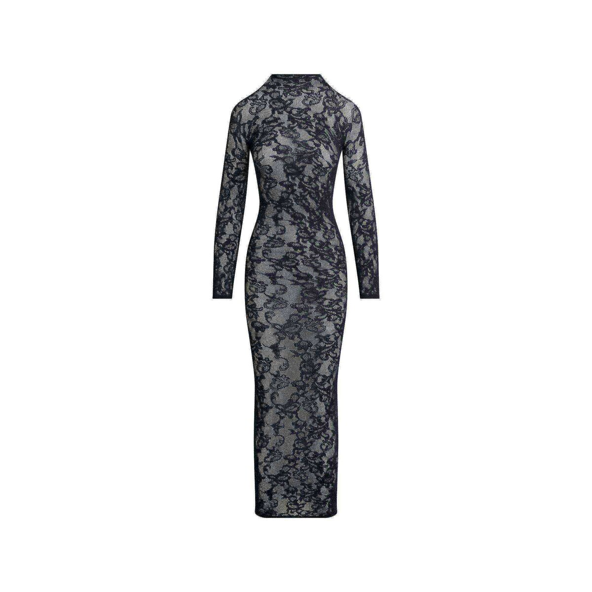 Make an entrance. Made with our sheer Knit Lace, this long sleeve dress features a mock neck and body-hugging fit for a striking look. Fits true to size.