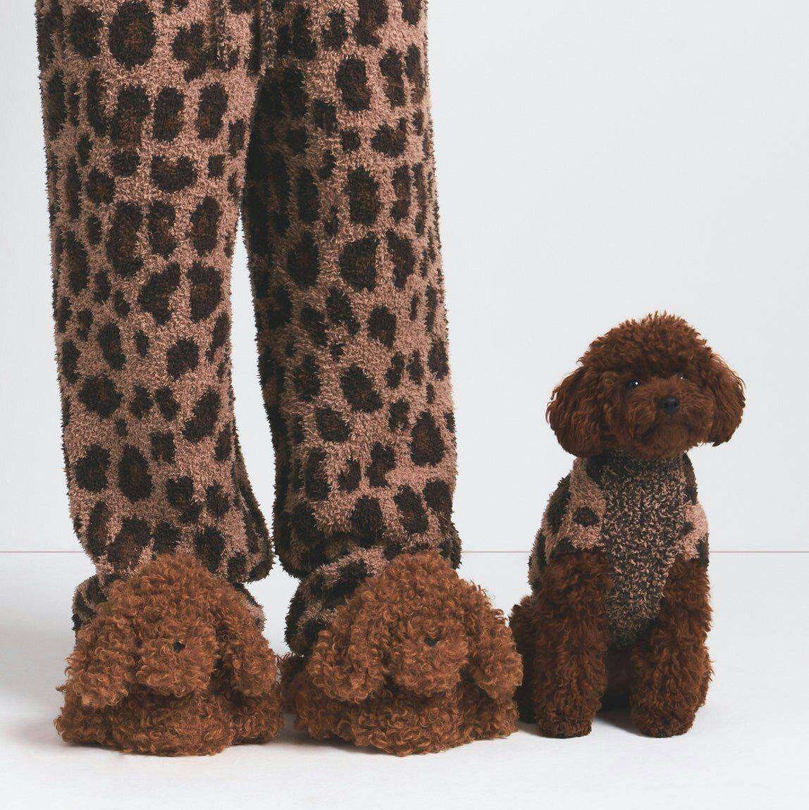 - Indoor dog slipper, Floppy ears and legs, Curly faux fur, Lined in felt, Soft sole with silicone grip