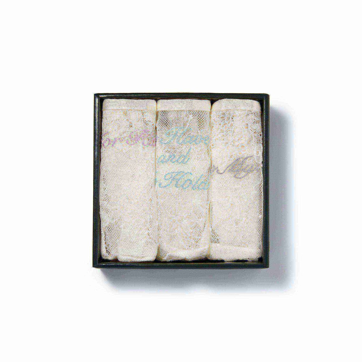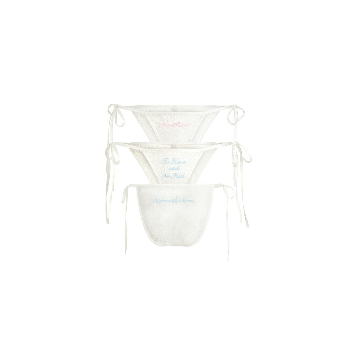 Bikinis you’ll have and hold forever. This sexy pack includes three panties, each embroidered with playful bridal phrases. Designed in our sultry sheer lace, each pair comes with silk sides ties for adjustability and a 100% cotton gusset. Fits true to size.