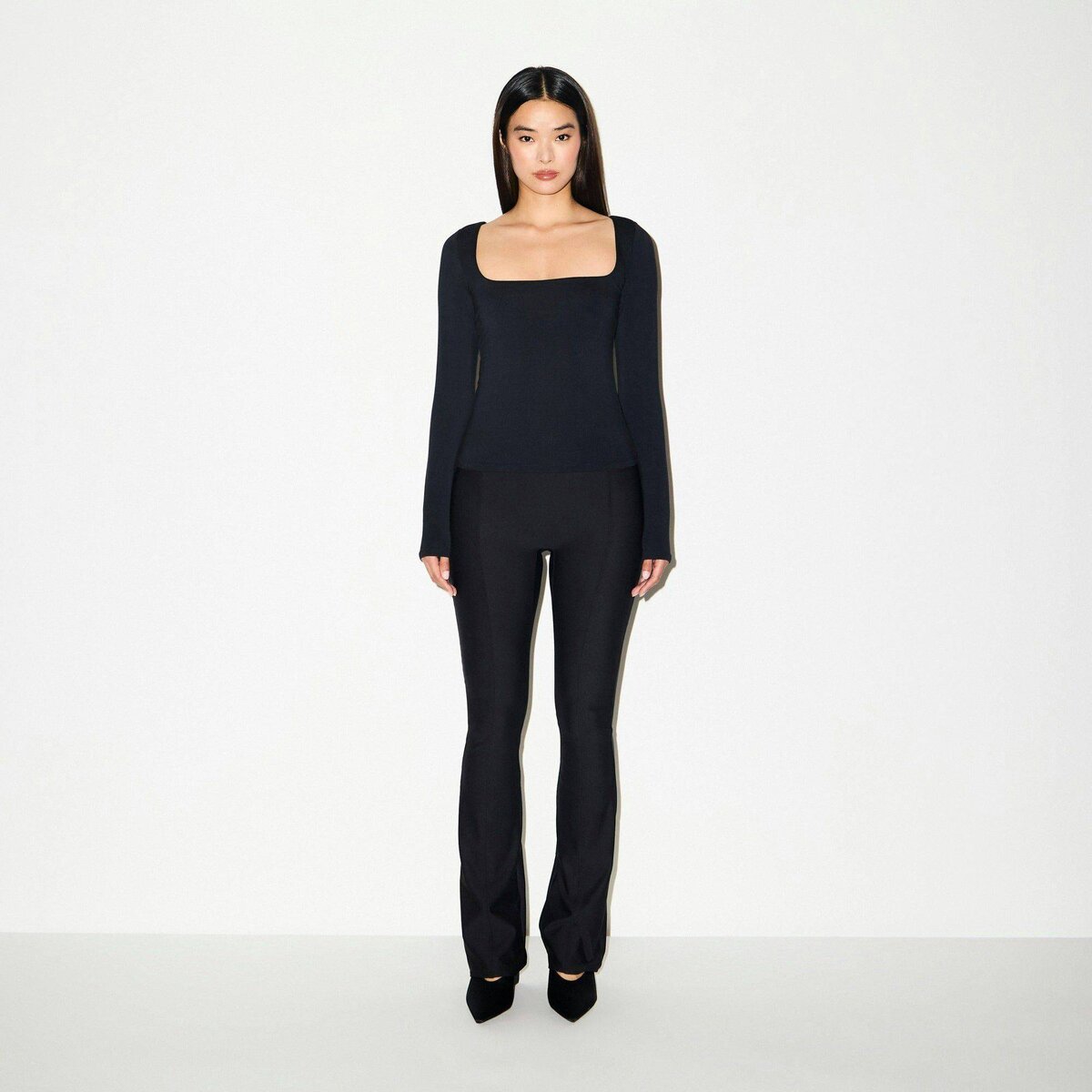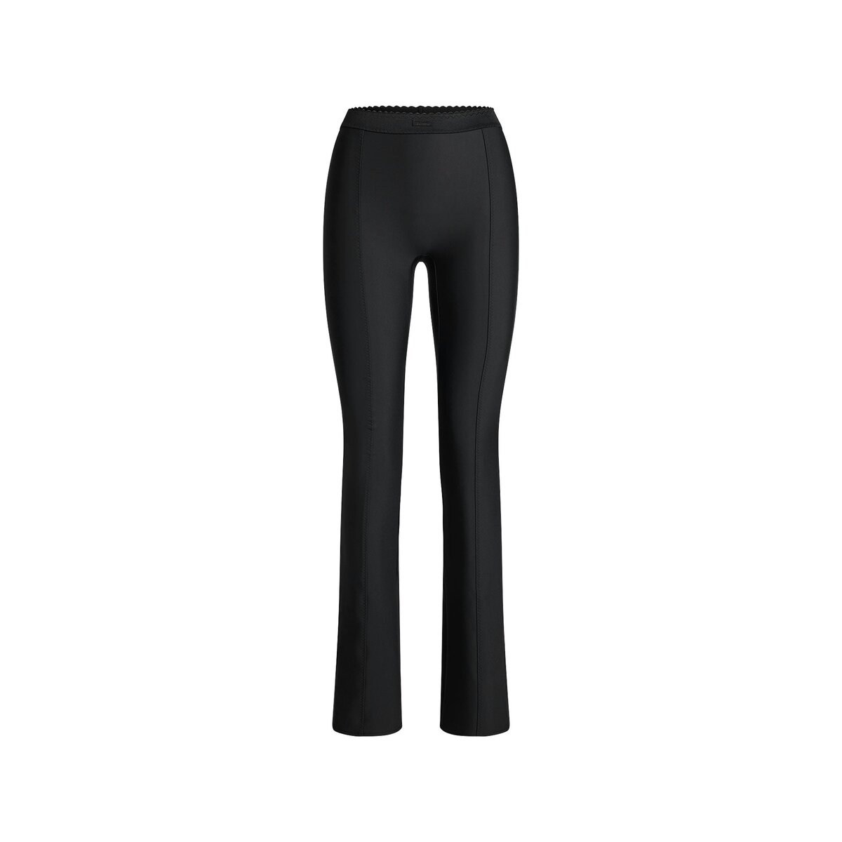 - High rise, Picot elastic waistband, Logo label at center front, Front and back seam details, Slim flare silhouette