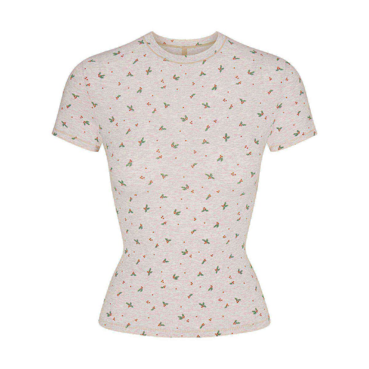 Our viral t-shirt in the cotton everyone craves. This perfect five-star tee is made with our stretchy, lightweight cotton that enhances your curves with its body-hugging fit and elevates your comfort with its incredibly soft feel. Features stitching details along the short sleeves and hem and hits below the natural waist. Fits true to size. Available in limited edition print: Oatmeal Holly Print.