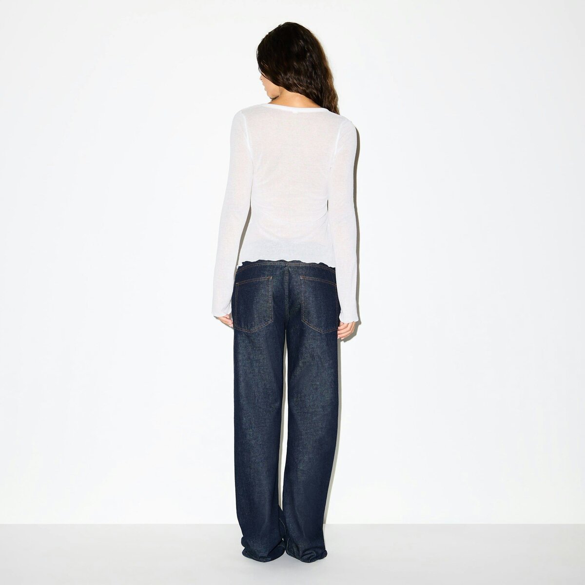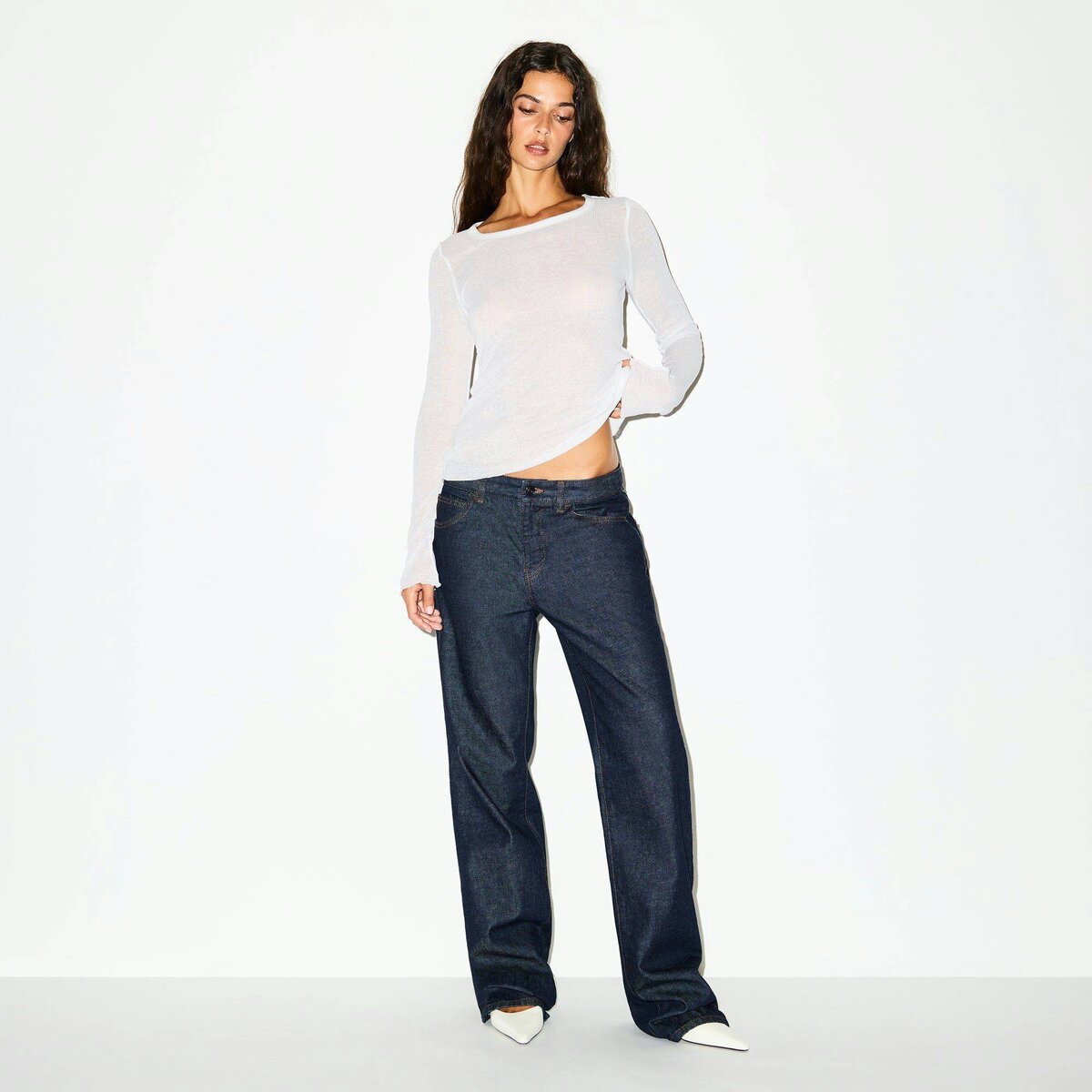 Elevate your basics. Lightweight and soft in our sheer ribbed fabric, this long sleeve features a wide jersey neckline and relaxed fit. Finished with contrast stitching at the hem and sleeves and fits true to size.