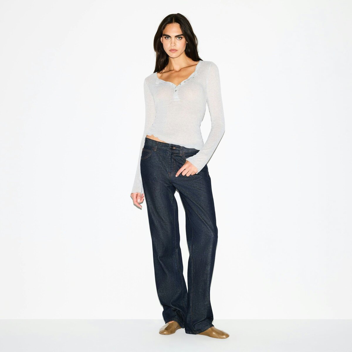 Airy, sheer essential. This long sleeve henley is made in our lightweight ribbed fabric for a flattering, sexy look. Complete with a center metal button closure and contrast stitching at the hem and sleeves. Fits true to size.