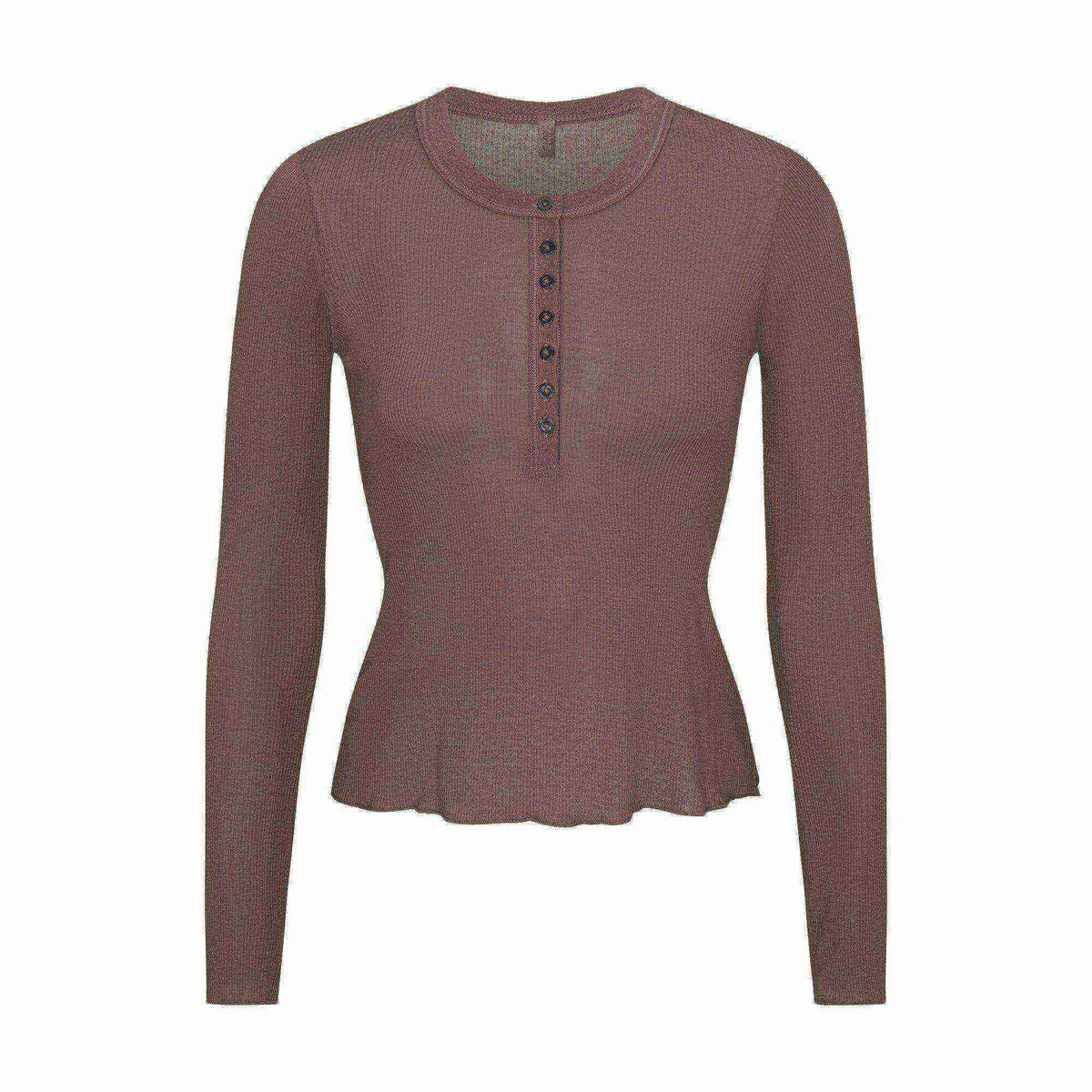 Airy, sheer essential. This long sleeve henley is made in our lightweight ribbed fabric for a flattering, sexy look. Complete with a center metal button closure and contrast stitching at the hem and sleeves. Fits true to size.