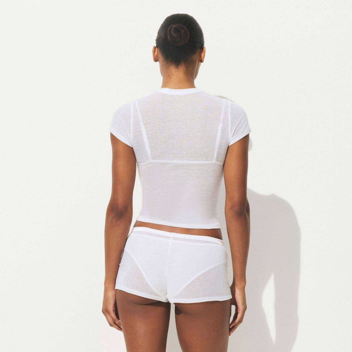 Sexy basics. With its bold, sheer look and slightly drapey fit, this is the elevated essential you’ll reach for every time. Features a high crew neck and fits true to size.