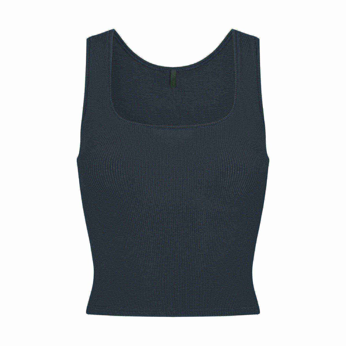 • Classic fitted tank, scoop front and back, Hits at hip, Ribbed fabric detail