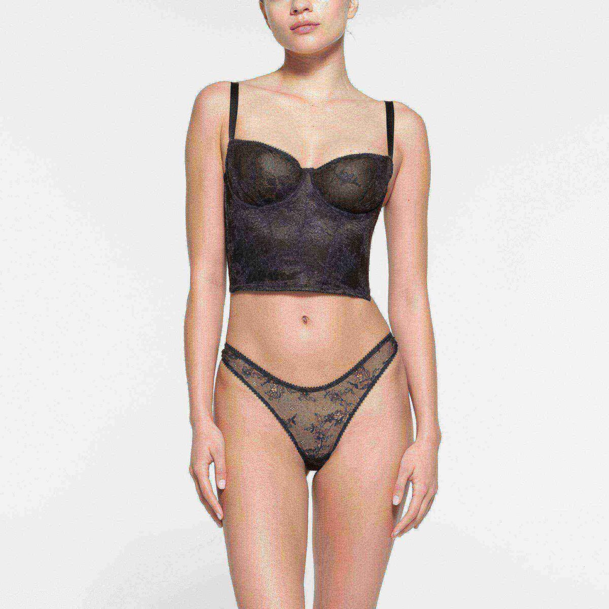 - Balconette neckline, unlined lace cups, underwire for support, adjustable straps, picot elastic at neckline, underarm, top wing and hem, steel boning at interior side seam, hook & eye closure at center back, designed in a sheer lace